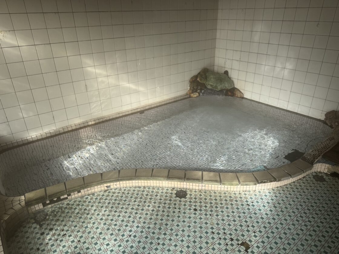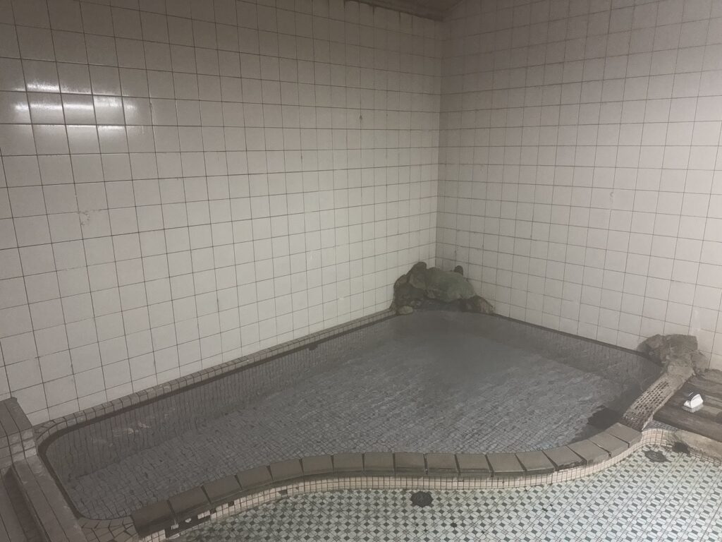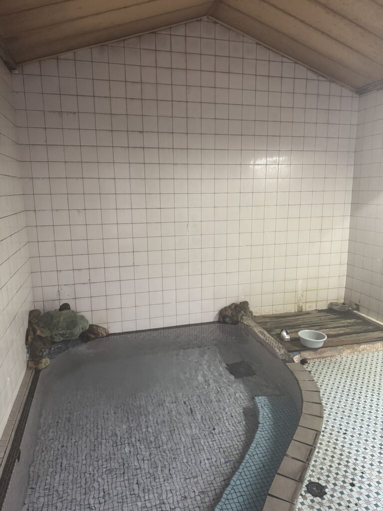 中に入ると、こぢんまりとした浴槽があり、その中に無色透明のお湯が注がれています。浴場内は、微かな硫化水素臭(ゆで卵臭)と水蒸気が充満しており、お湯が注がれる「ザー」という音が心地よいです。このサイズの浴槽に対して毎分149lとなると、お湯の鮮度は非常に高いと言えるでしょう。