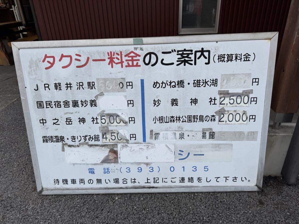 駅前にタクシー料金の目安一覧が置いてあったが、かなり以前に制作・設置されたもののようで、昨今の物価状況が反映されていない。概算表示では金湯館までの料金は「5,200円」(右下)と書かれているが、実際の金額は「7,810円」だった