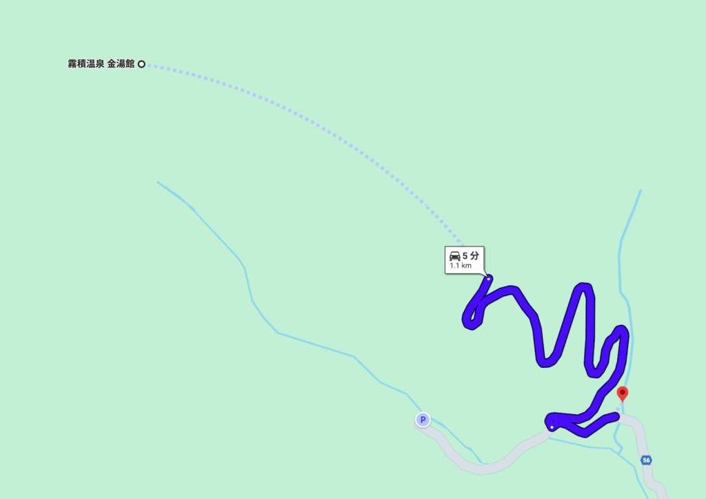 横川駅から国道18号線→国道56号線と進み、霧積湖(県施工第一号のダムとして1976年に建設された人造湖)を過ぎると、56号線の終着点に到着。ここからさらに、一般車両は進入禁止の金湯館専用私道を進んでいきます。
