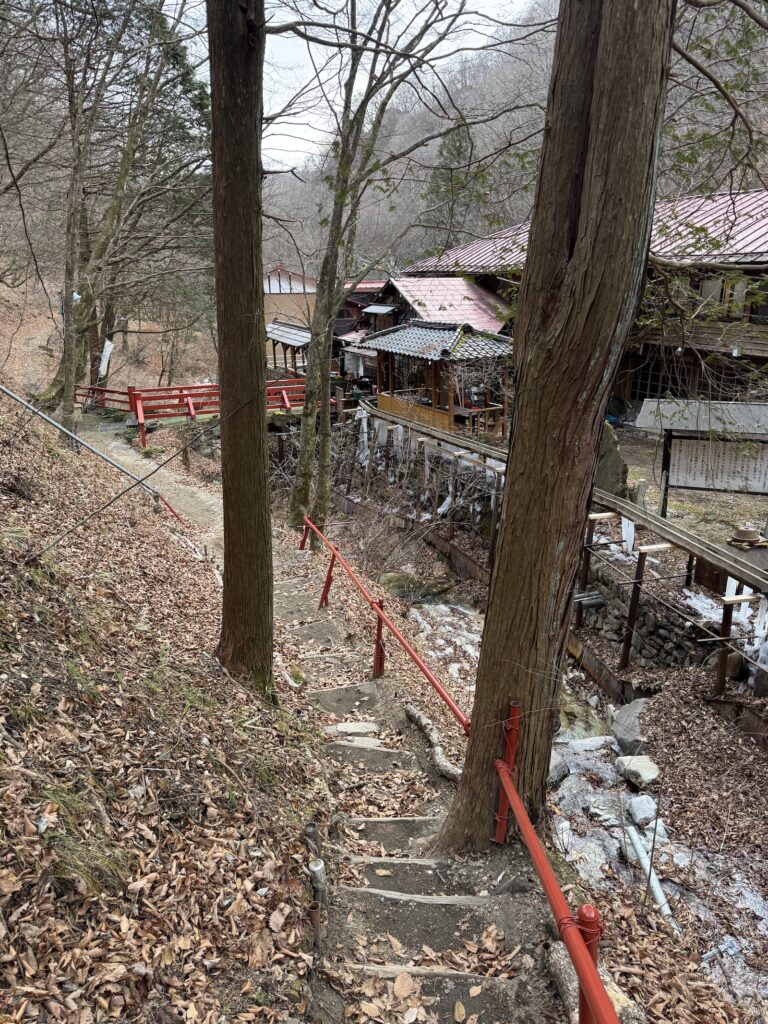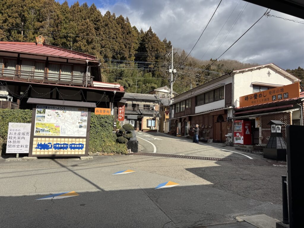 金湯館の最寄り駅は「JR横川駅」。駅弁「峠の釜めし」で有名な “おぎのや” 横川店(会社所在地)があることで有名な駅です。そこから約13km、山中に入ったところを目指すわけですが、当然ながら徒歩は現実的ではありません。電車移動の場合は、ぜひ、お宿からの送迎を使うといいでしょう(要事前予約)。