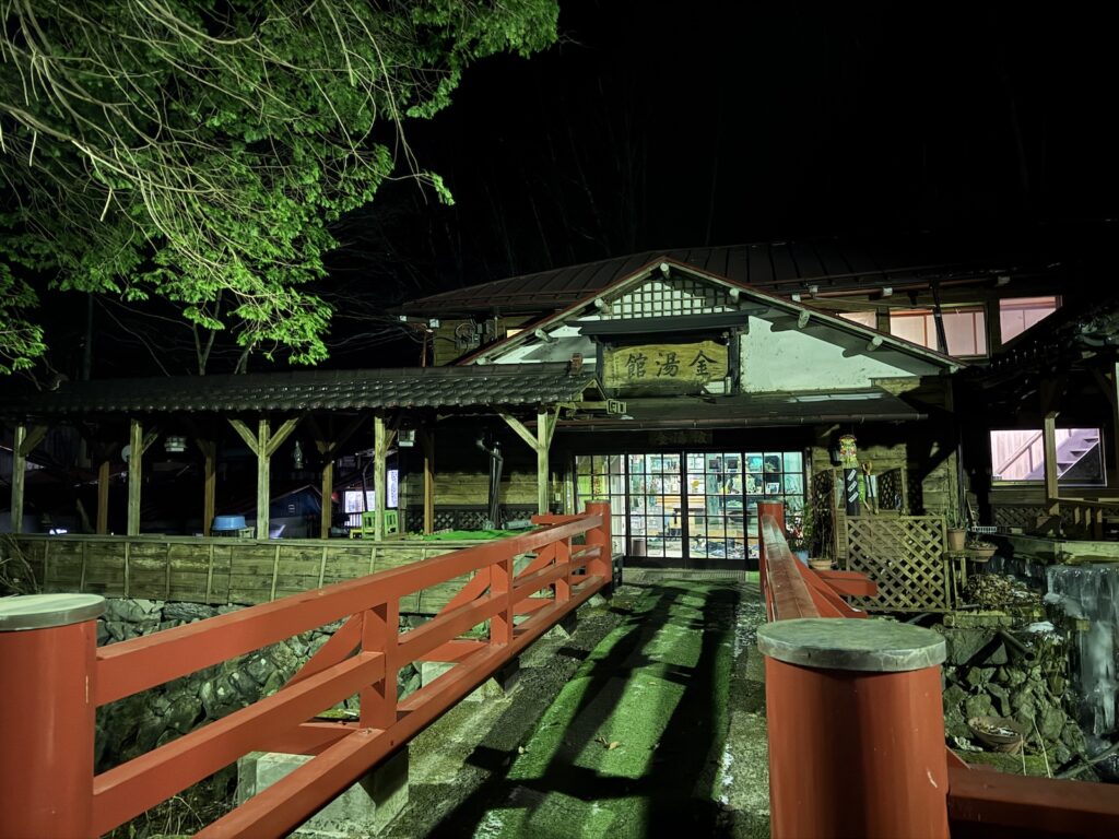 夜の金湯館の入り口。渓流の音以外は何もしない、非常に静かな時間だった
