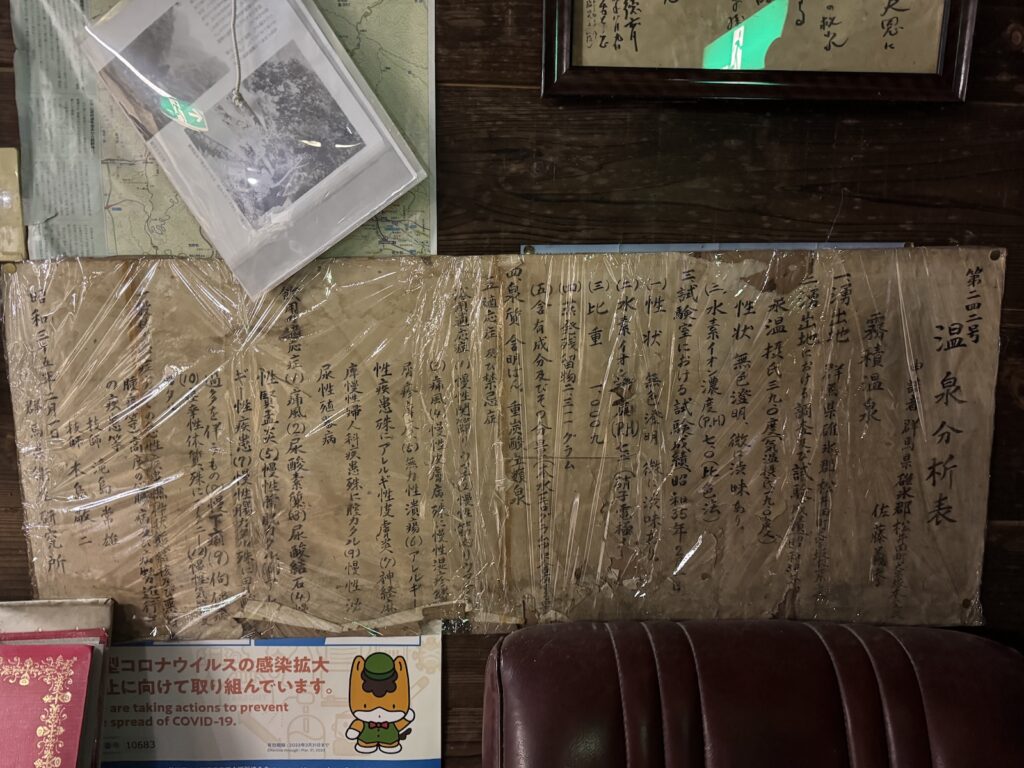 年季の入った温泉分析表(最新版は浴場の着替えスペースにあり)