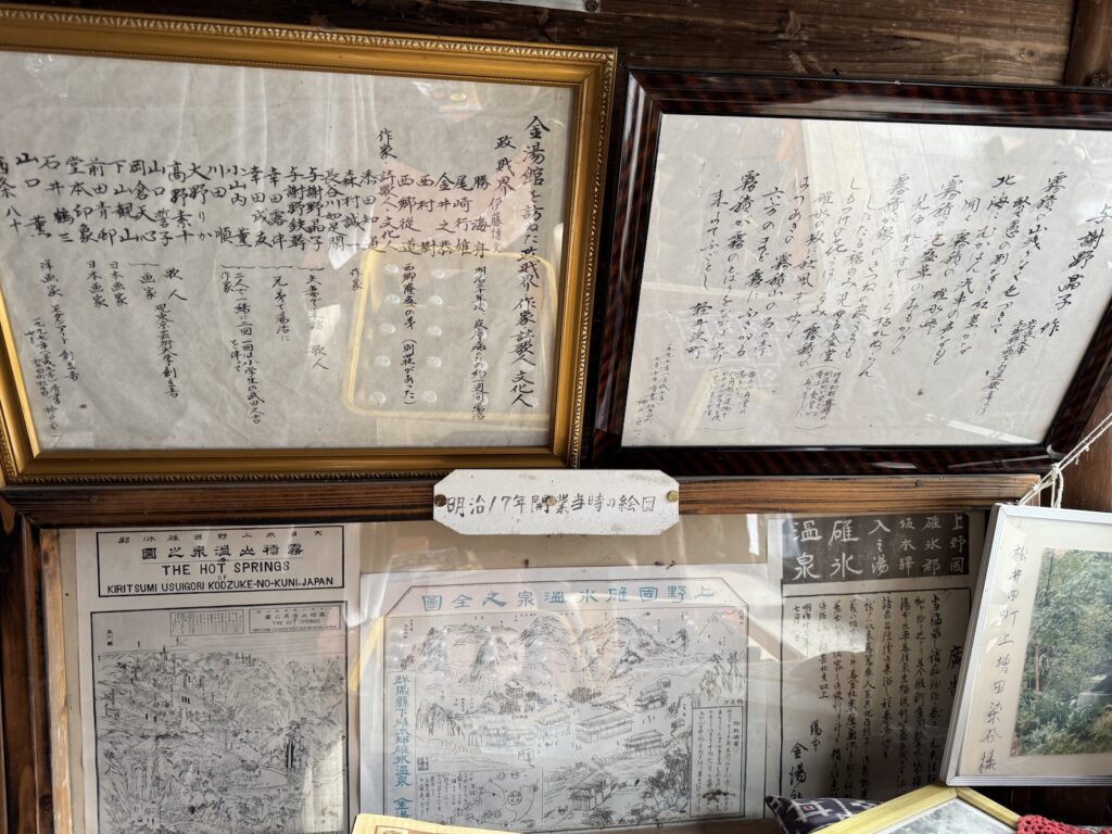 「金湯館を訪れた政財界・作家・詩歌人・文化人」一覧や、与謝野晶子作の詩、明治17年の開業当時の絵図など、歴史を感じる資料が展示されている