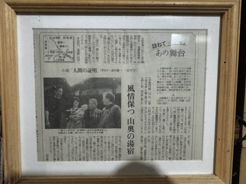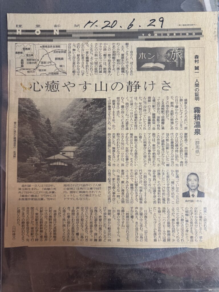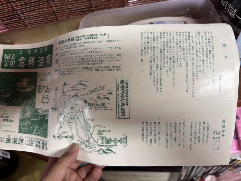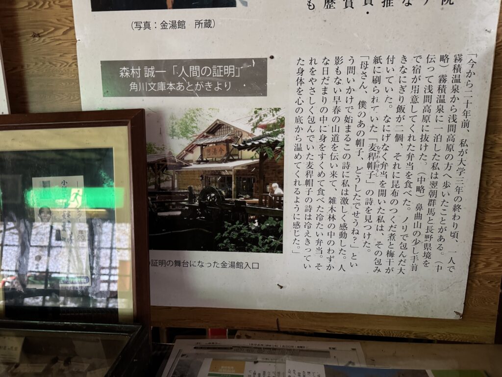 森村誠一は、大学生の時、金湯館に宿泊してハイキングに出掛けた。その際に、山の頂きで宿のお弁当の包み紙に刷られていた、西条八十の詩 「ぼくの帽子」が目に留まったことで、それから20年以上経った昭和50年代の初めに、大ヒットした『人間の証明』を世に出すに至ったという。「母さん、僕のあの帽子、どうしたんでせうね?ええ、夏、碓氷から霧積へゆくみちで、谷底へ落としたあの麦わら帽子ですよ。〜」