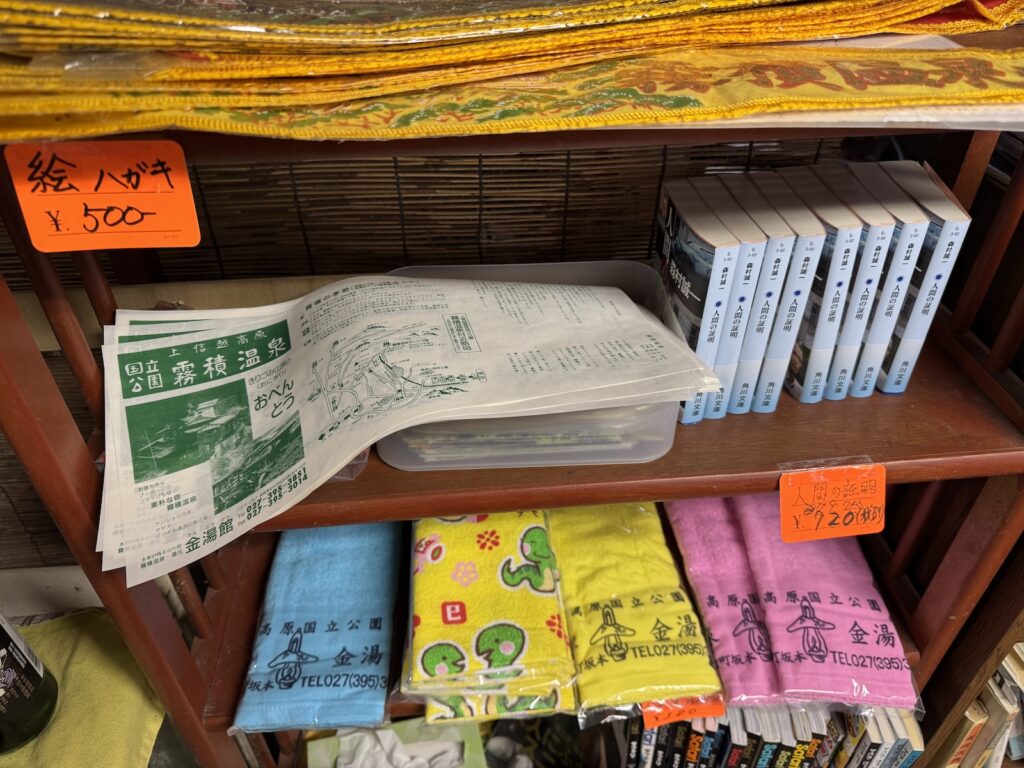 売店ではタオルのほか、『人間の証明』の文庫本も購入できる。また、森村誠一が山の頂きで見た宿のお弁当の包み紙も置いてある