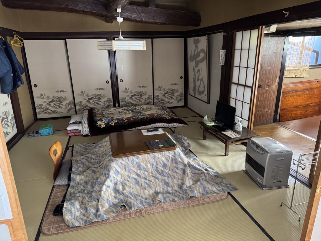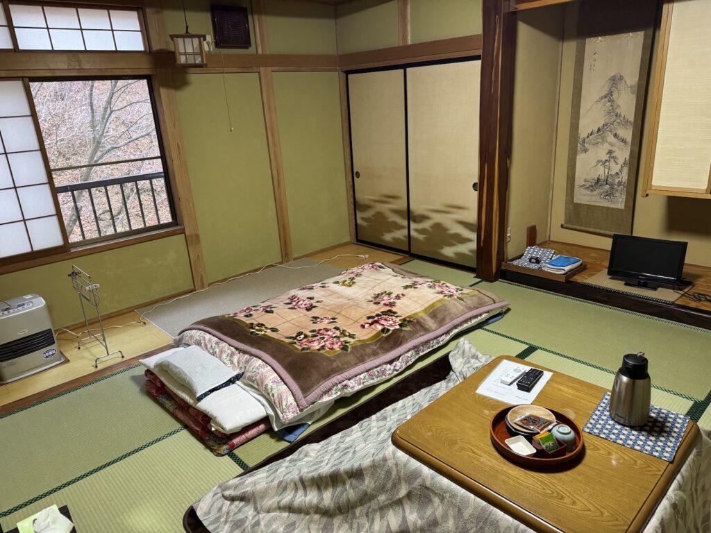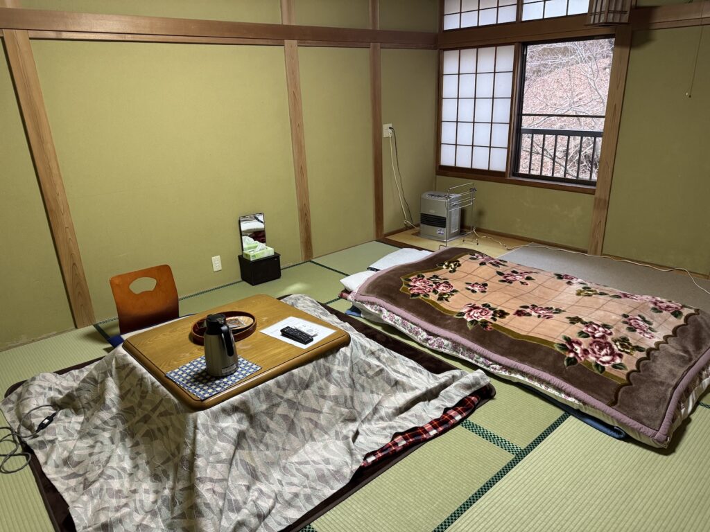 今回のお部屋は、2階の別館にある203号室。トイレ・洗面台は共同。8畳のこぢんまりとした空間にこたつがあって、落ち着きます。