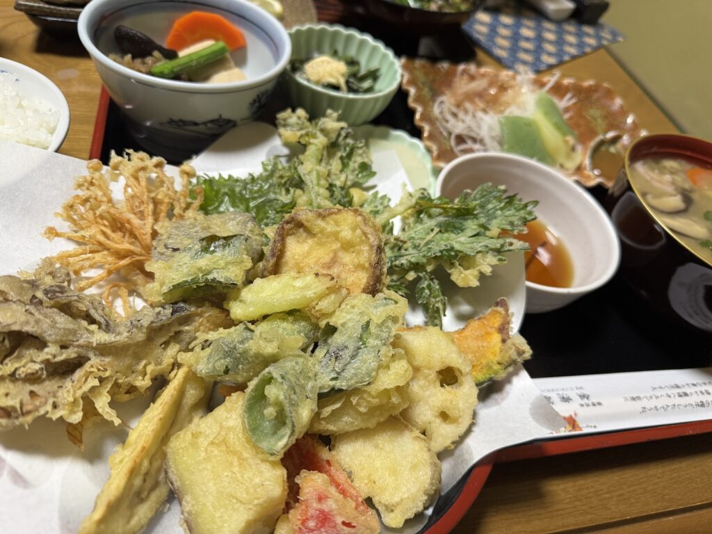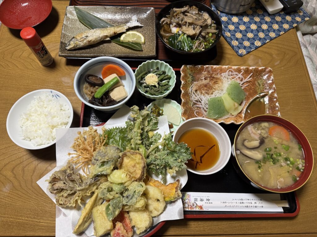 お食事はすべて部屋食です。一泊目は基本的には地場の食材を使った天ぷらとなっており、受付のホワイトボードに「本日の天ぷら」の素材が紹介されています。要チェックです。