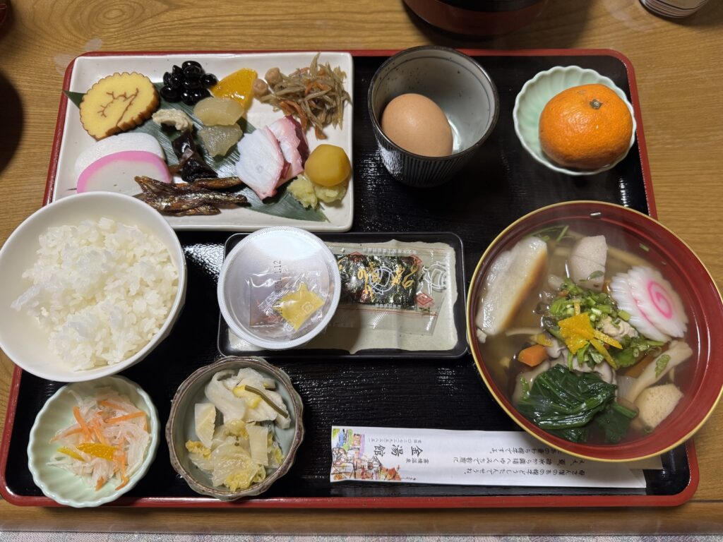 この日は1月1日ということで、おせち仕様の朝食。特に、お雑煮をいただけるとは思っていなかったので嬉しかった
