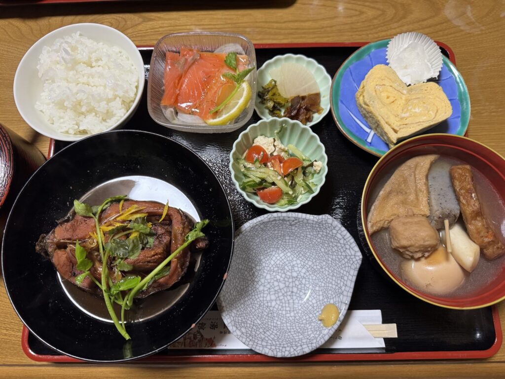 2泊目の夕食のメインディッシュは鯉のうま煮。また、味の染みたおでんも提供された