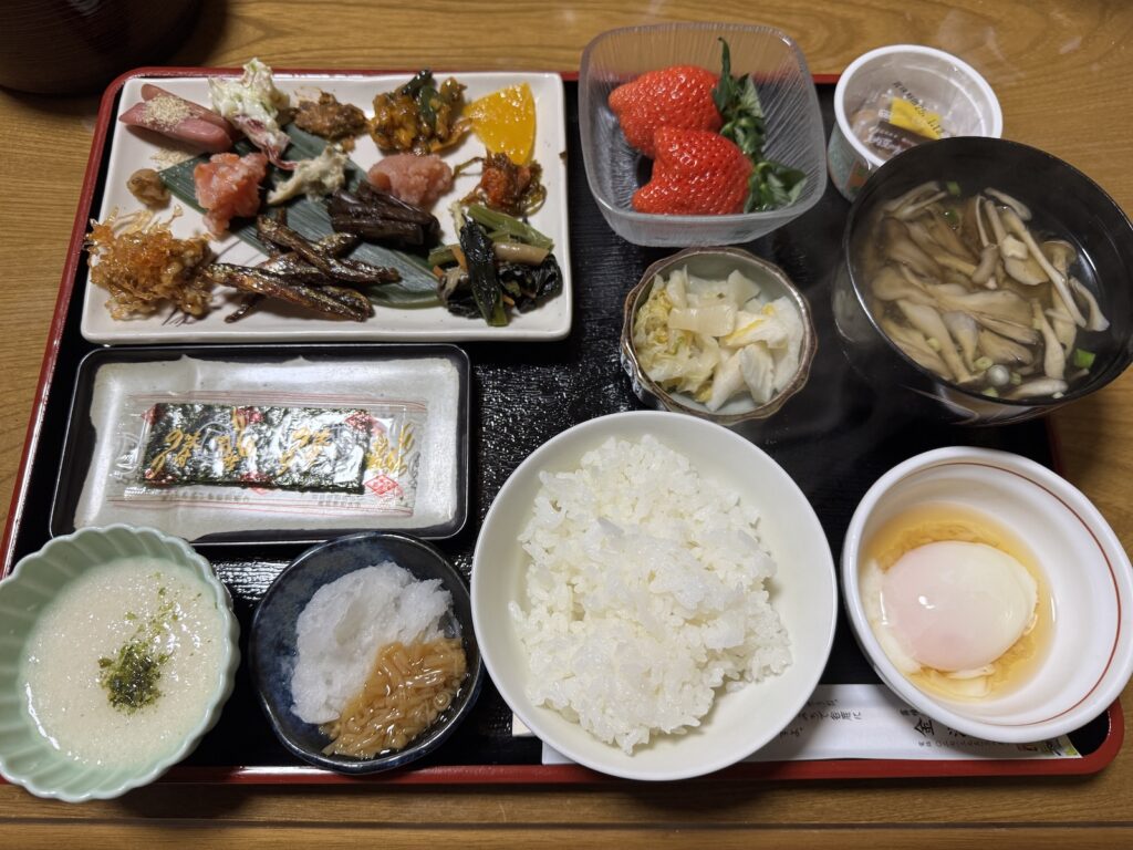 2泊目の朝食。佃煮の盛り合わせはもちろん、きのこ汁が美味しく、また、デザートにいちごが出るのもありがたかった