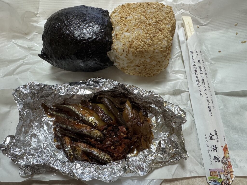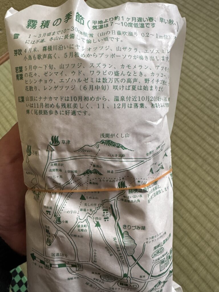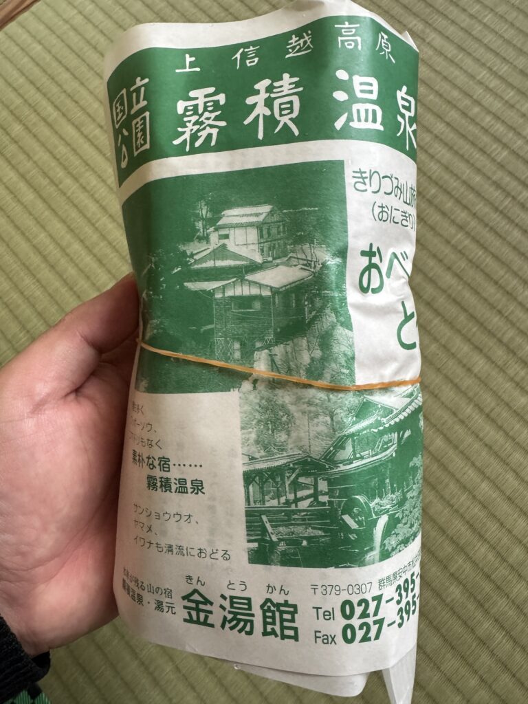 チェックアウトした後のお昼用に、名物「おにぎり弁当」を購入しました。包み紙は先述した通り、森村誠一が『人間の証明』に向けてインスパイアされた当時のものです。