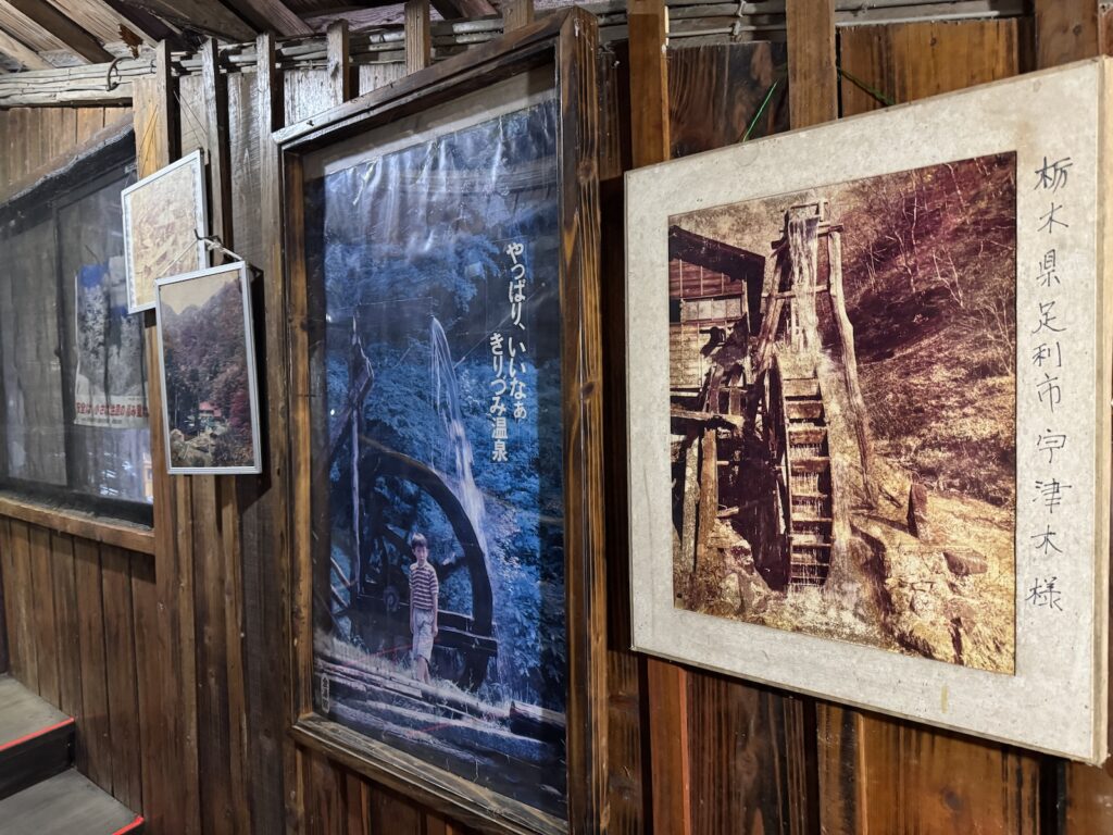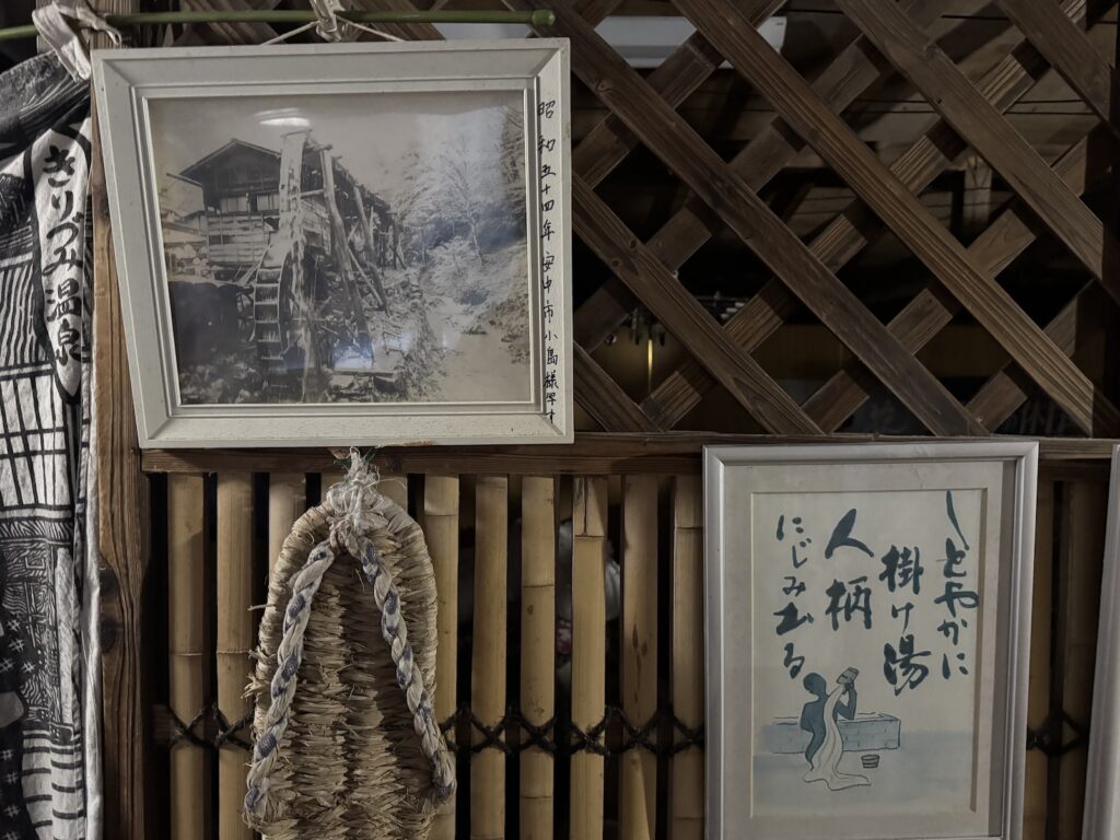 受付に入って左側に進むと、浴場まで続く通路に出ます。およそ30秒ほど歩くと浴場に到着するのですが、この廊下の両側に展示されている写真や新聞の切り抜き、ポスター、色紙等が、宿の歴史を感じさせてくれます。