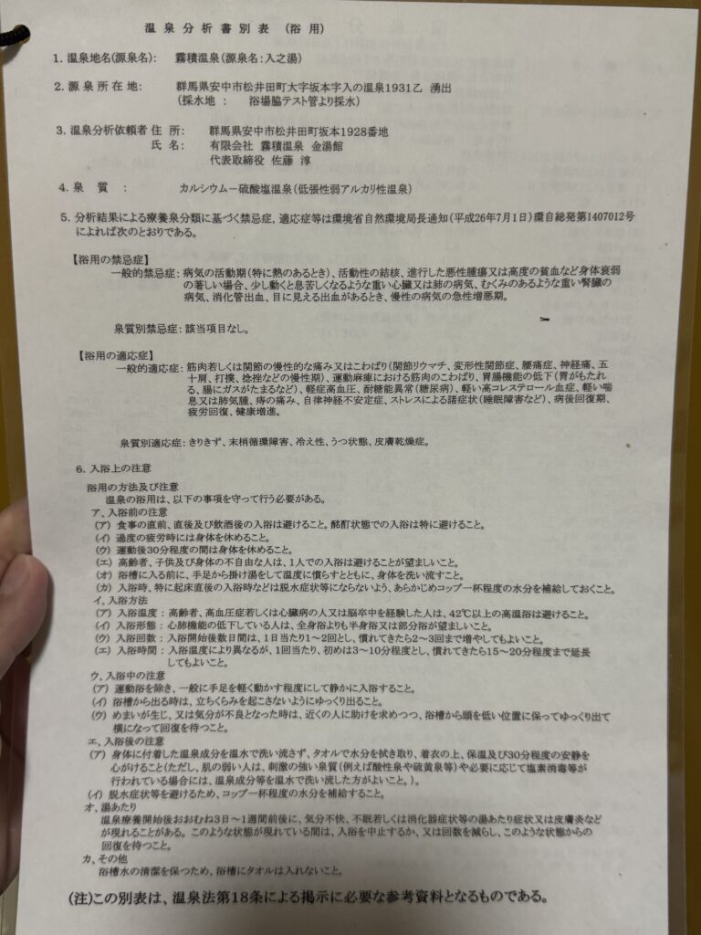 記載はありませんが、加水・加温はなされておらず、循環濾過装置の使用や薬剤の投与もなされていないとのこと。ちなみに、ホームページでは「毎分300lが湧き出ている」と表記がありますが、温泉分析書を見ると、現在は「毎分149l」のようです。