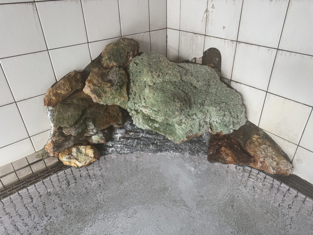 お湯が注がれる場所には石が積まれており、緑青色の析出物が固まっている