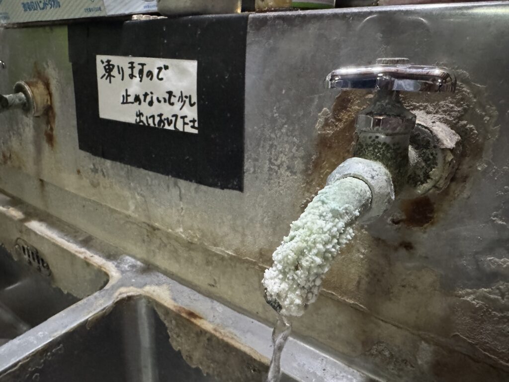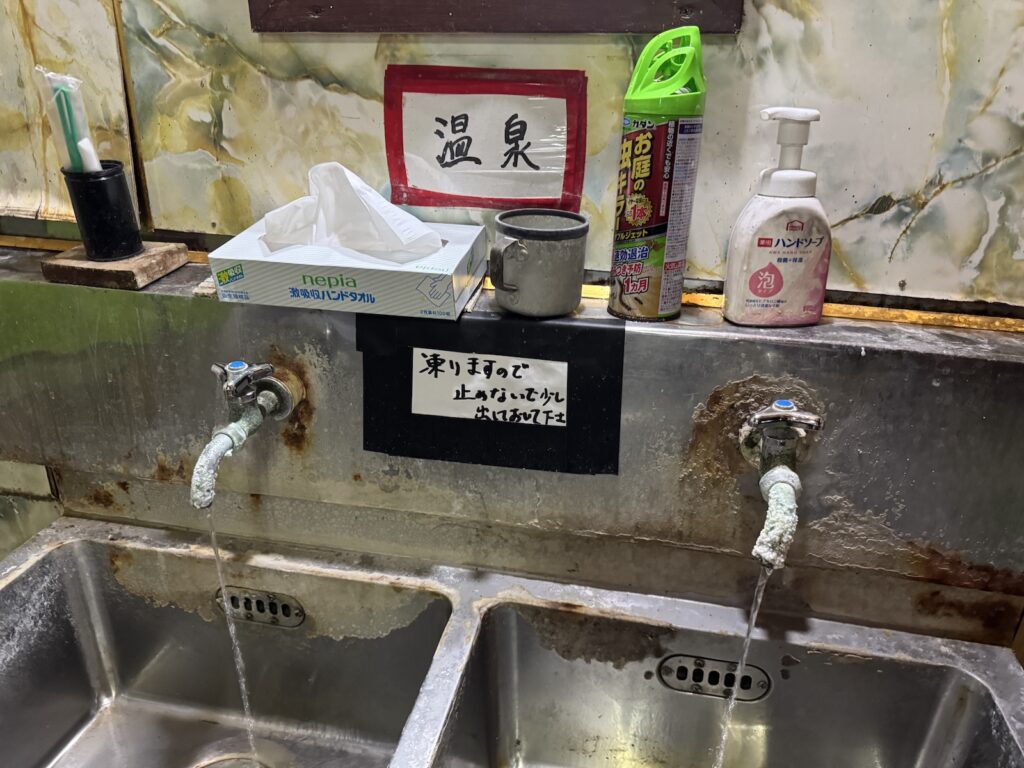冬季は管内のお湯が凍ってしまい復旧が大変になるので「蛇口は止めない」運用の注意書きが貼られている