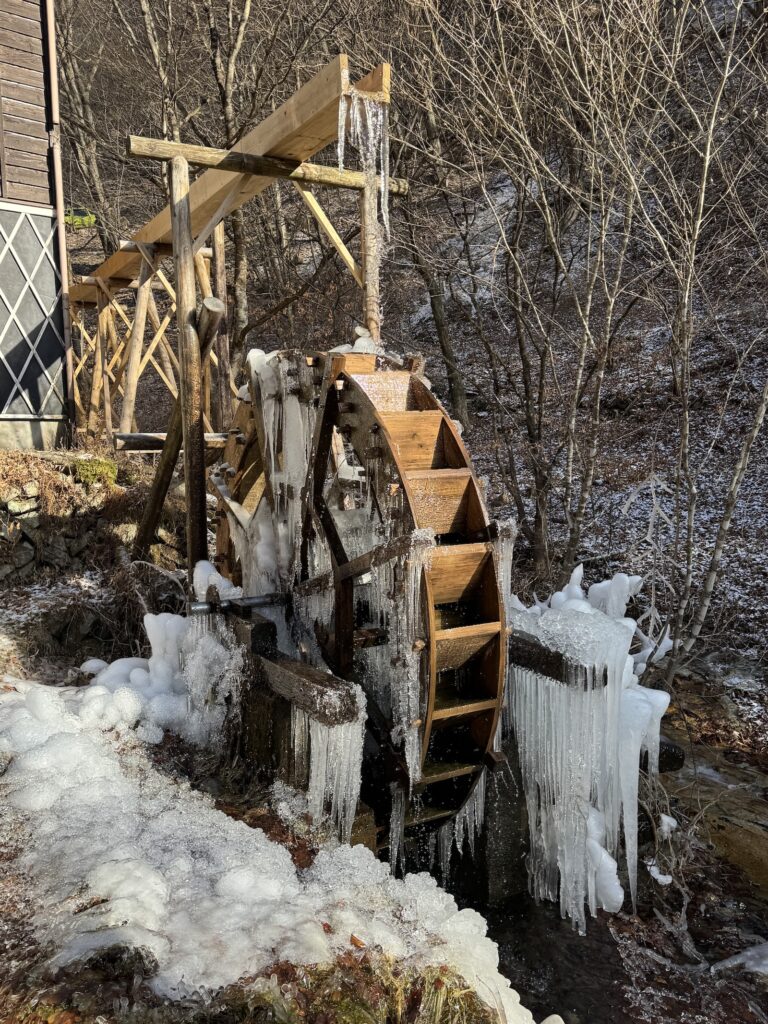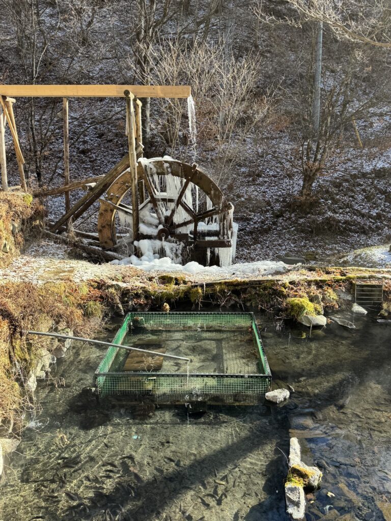 金湯館の名物の一つ、水車。昔はこれで自家発電をしていたらしい。「明治から昭和11年まではランプだけ、その後はランプと水車による発電、昭和30年からは、ディーゼルエンジンを導入して、自家発電をしておりました」とホームページに記載されている